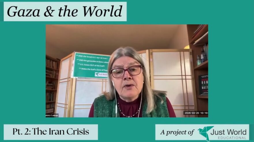 Cobban was speaking during the eighth episode of Just World Ed’s current “Iran Crisis” series, which is part of our continuing project on “Gaza and the World.”