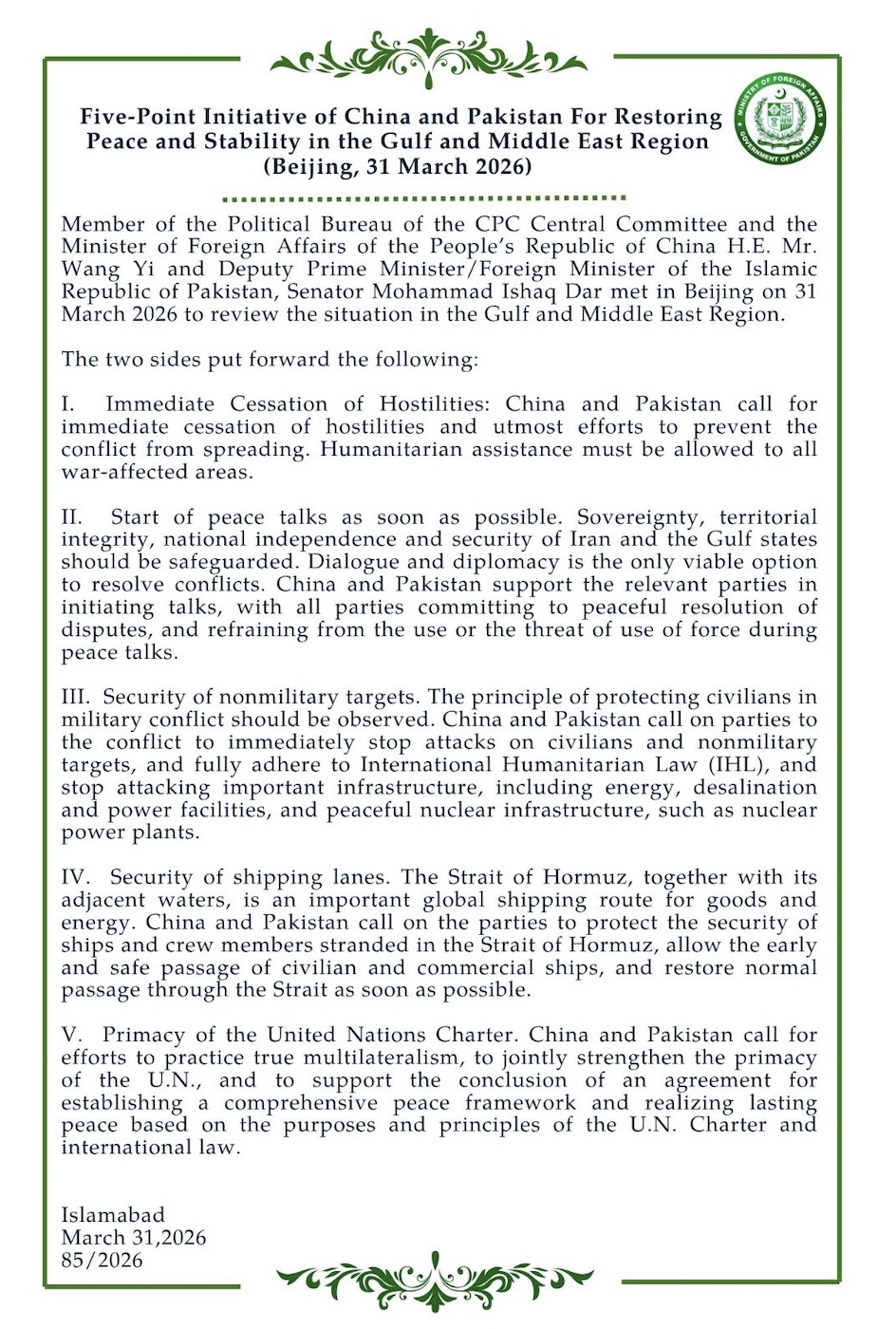 You can see the full 41-minute conversation with Amb. Freeman on Youtube, here. Listen to the audio on Apple Podcasts or Spotify, or read the transcript here. Plus, you can download the text of the Chinese-Pakistani initiative as released in Beijing and Islamabad on March 31, here.